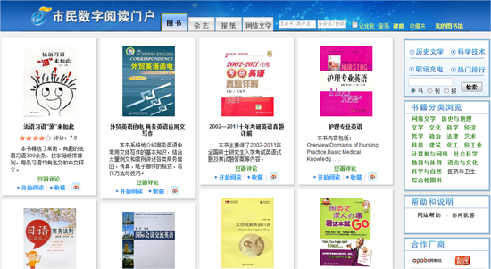 在上海圖書館建館60周年之際,上海圖書館推出“上海市民數(shù)字閱讀推廣計劃”,2012年主題是“館藏數(shù)字資源介紹及新技術(shù)體驗互動”。據(jù)介紹,該閱讀平臺為上海市民數(shù)字閱讀的統(tǒng)一入口,讀者證登錄一次即可使用網(wǎng)站的所有資源,不分卡的功能權(quán)限。資源上包括50萬冊方正電子書、400余種方正數(shù)字報、1000余種時尚期刊及多種多媒體館藏精品,并且資源會在首頁上動態(tài)滾動呈現(xiàn)。