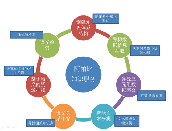 知識服務(wù)涉及多方面技術(shù),方正阿帕比形成了整體的知識服務(wù)解決方案。整體知識服務(wù)解決方案中包括知識體系結(jié)構(gòu)創(chuàng)建,異構(gòu)數(shù)據(jù)抽取,三元組數(shù)據(jù)整合,文本智能分類,語義關(guān)系計算,基于語義的資源數(shù)據(jù)掛接以及語義檢索等。